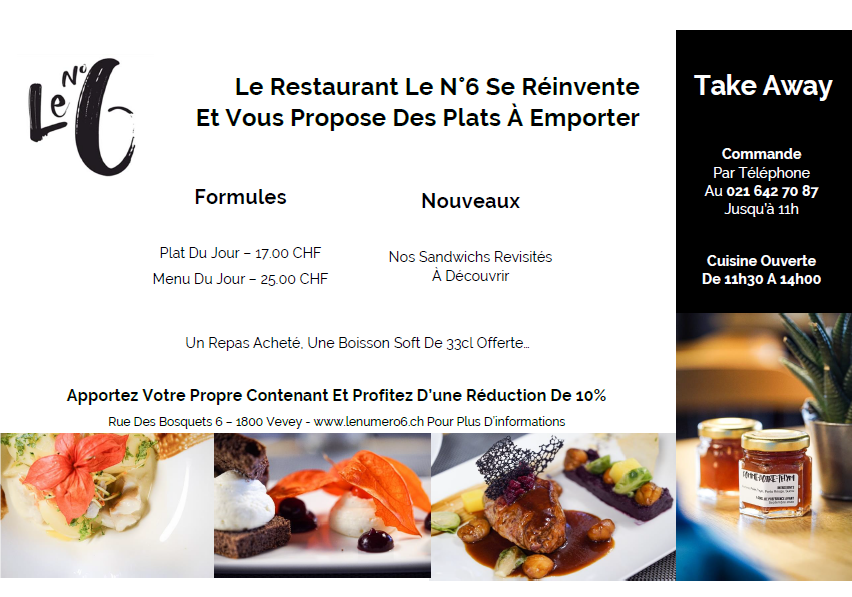 Notre restaurant Le N°6, rue des Bosquets 6 à Vevey, propose dès maintenant, des plats à emporter. Cette offre se maintiendra également après le semi-confinement.